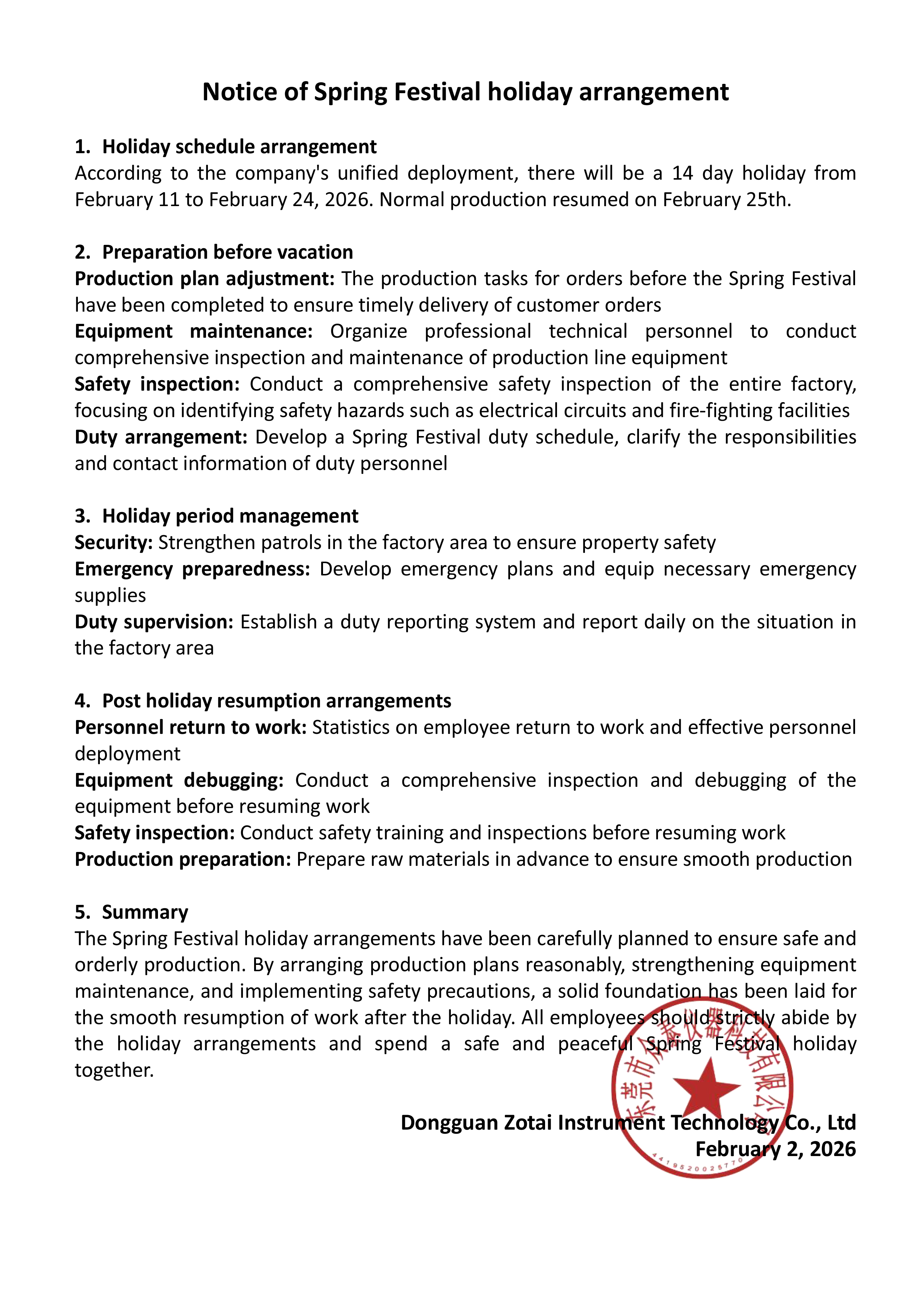 4. During the holiday period, business inquiries about the lab test equipments can be made to the on duty personnel (contact information: sales3@zotai-tec.com), and we will respond promptly.